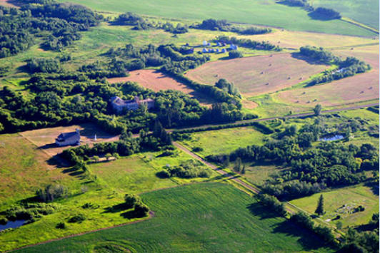 Structures in the distance are an old house and modern metal silos.