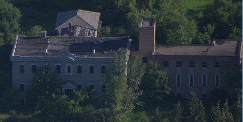 As we come closer to the church, we see, behind trees, a large