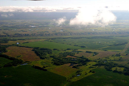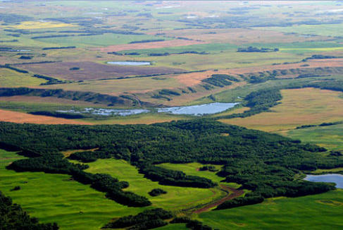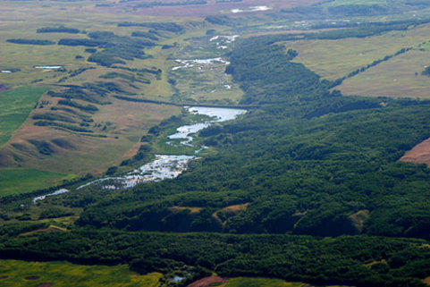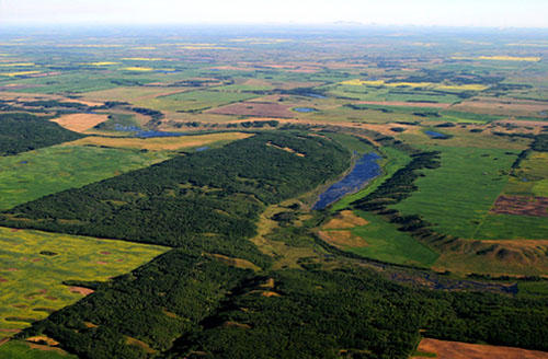 Long, winding Pipestone Creek and tributary bulging into several elongated lakes where dams control the water flow