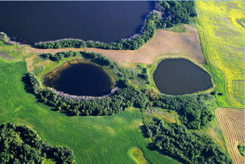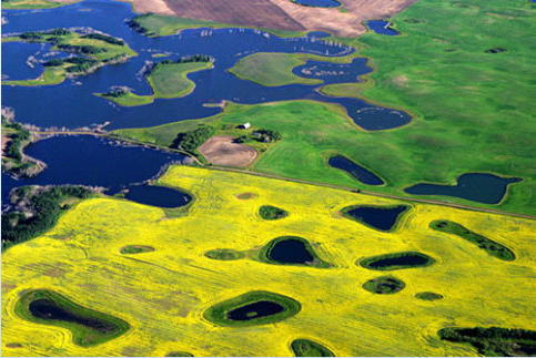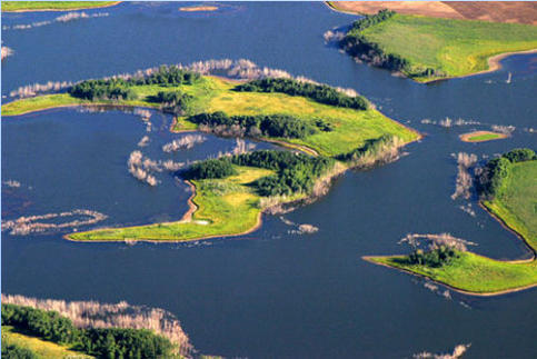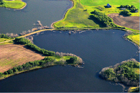 Land-and-water jigsaw maze, reminiscent of the Lake of the Woods region, but repainted in bright prairie hues