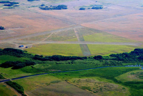 Triangular shape on the ground indicating runways of a WWII-vintage training airport Many are still used today for modern purposes. The air chart indicates this one would be: glider airport CYA 308, north of Odessa.