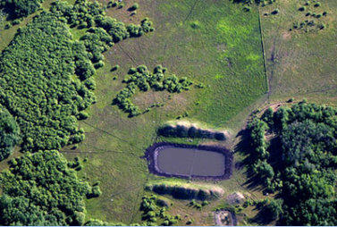 Rectangular ponds with lines etched in a radiating pattern out from the water, indicating a dug out livestock watering hole, and the favourite repeated routes to and fro