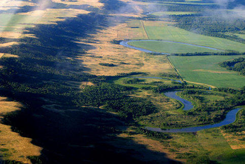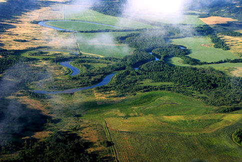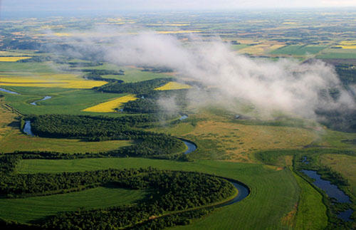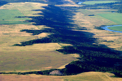 The Assiniboine embankment casting long shadows to the west, pointing us toward Regina (viewed out the pilot's window)