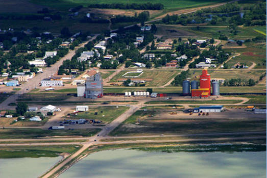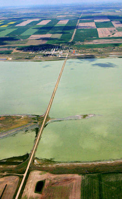 Now we're lined up with our moth-island and see that the dike/road stretches right across the lake, to the town of Morse. Perched between the flat expanse of lake and a checkerboard of grain fields, the town is pretty with many trees shading its houses.Two large grain elevators with additional silos indicate it's an important inland grain terminal.This link describes another interesting landmark in the town.