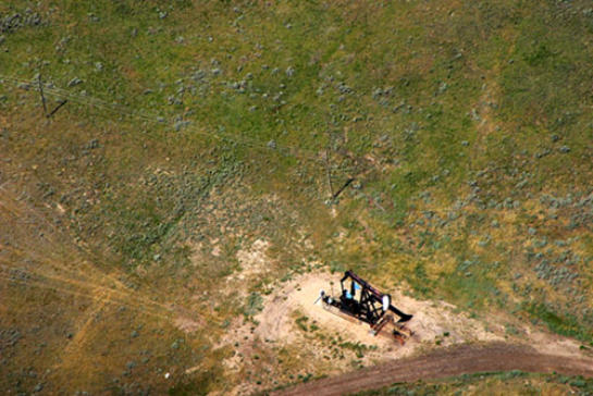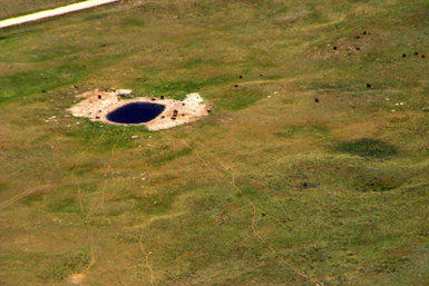 Alternating with the cattle watering holes (those patches on the ground with dark centres and spidery spokes), another prairie feature appears that's not familiar to us in Waterloo Region.Circular or square patches at the end of at least one wide line (a road), have dark centres brightened with painted spots of red or blue.These are oil rigs, set up to pump the "black gold" out of the depths of the earth. Here we see two of the over 70 in Saskatchewan.The sun is high; we barely see the hydro lines & shadows.