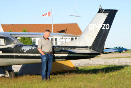 With our late start and strong headwind, we're out of luck getting gas for the next leg to Sault Ste. Marie -- the pumps are already closed.End of journey for the day.Robbie Colwell, the very friendly and helpful airport manager, offers us the use of a courtesy car to go into town. We're excited to see the town of Gore Bay again-- warm memories of a previous camping holiday.After supper and a short drive to the fish hatchery overlooking the bay, we head back and pitch our tent under FZO's wing before dark.The tent floor is rather hard without underlay pads, forfeited to keep baggage weight down, but we sleep well with the satisfaction that our trip is really happening!