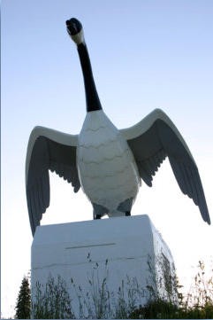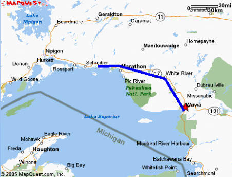Up at 5 a.m. It's true: the weather has passed through, and we have a clear, sunny day! The air is fresh, cool, tinged with the scent of forest. We have breakfast at Wally's restaurant right when they open at 6 a.m. The rising sun is a magnificent red ball in the sky.Across from the airport, we visit the Goose monument and take some pictures before heading out to Terrace Bay. Since we saw Graeme Ferguson's second IMAX movie "North of Superior" (1971) at Ontario Place many years ago, we're excited we're finally about to see some of the real thing ourselves!Loosely tracking the Trans-Canada Highway (Hwy 17), we make the old pilot joke that we're flying IFR (Instrument Flight Rules), but with its "other" meaning: "I Follow Roads."
