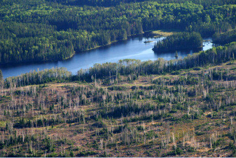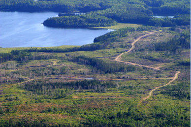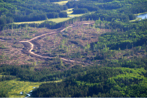 All this time we're flying over the seemingly endless Algoma Forest.Brown earth patches, areas which have been cut, provide a dark backdrop for the new light green growth.Such patches seem to be the "Middle of Nowhere" to which the numerous roads criss-crossing the wilderness are leading.Clergue Forest Management Inc. and Algoma Metis Loggers websites describe various aspects of forestry issues.