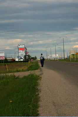 We take a taxi into Brandon, and check in to a motel.On our way to a restaurant, Werner looks like he's in a scene from some Canadian movie: walking down a long road, with clouds creating a certain nostalgic atmosphere or a sense of destiny...