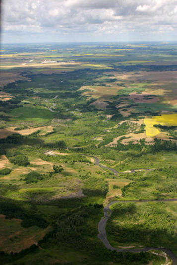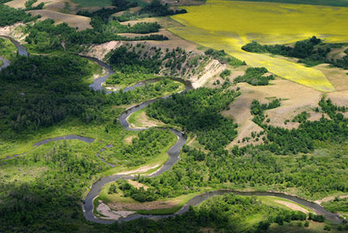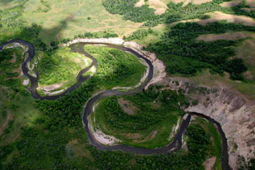 Apparently, meandering is how prairie rivers prefer to travel.This is best done in a wide, flat valley. Embankments (gentle slopes sporting bushes and trees, or steep slopes creating dramatic rocky edges) define a general winding shape through the landscape, wherein the river is free to wriggle, twist, and turn ad libitum...