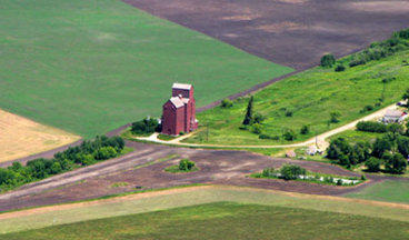 Grain elevators looking like red milk cartons in a cluster
